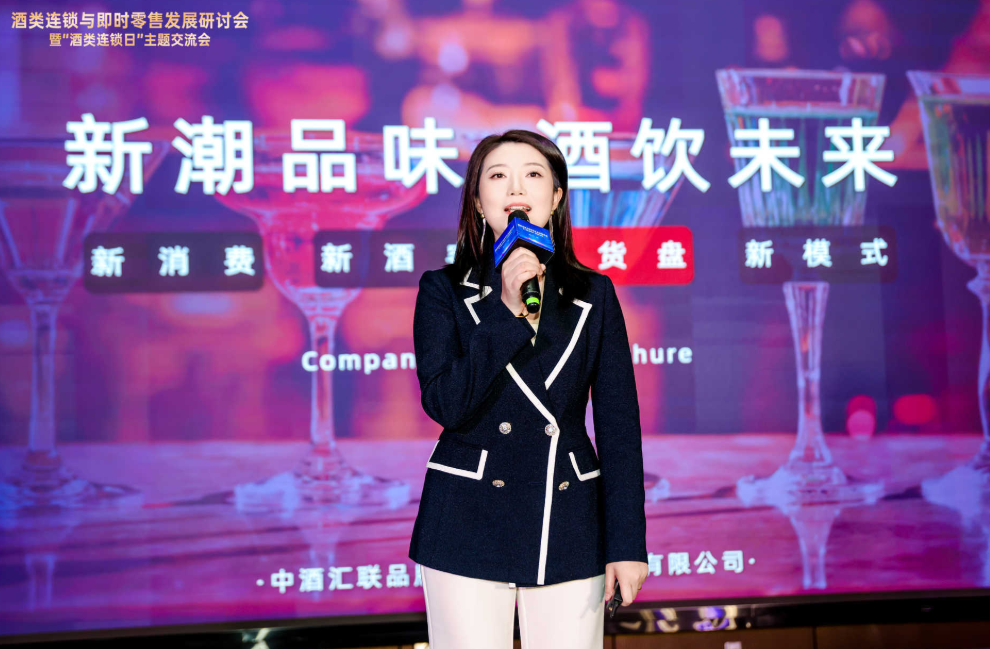 中酒汇联平台管理(四川)有限公司副总经理马宏丽介绍了中酒汇联作为协会指导下成立的供应链创新服务平台,如何通过“共商、共建、共享”原则为全国连锁企业提供产品、品牌、营销、金融、物流等全方位赋能。