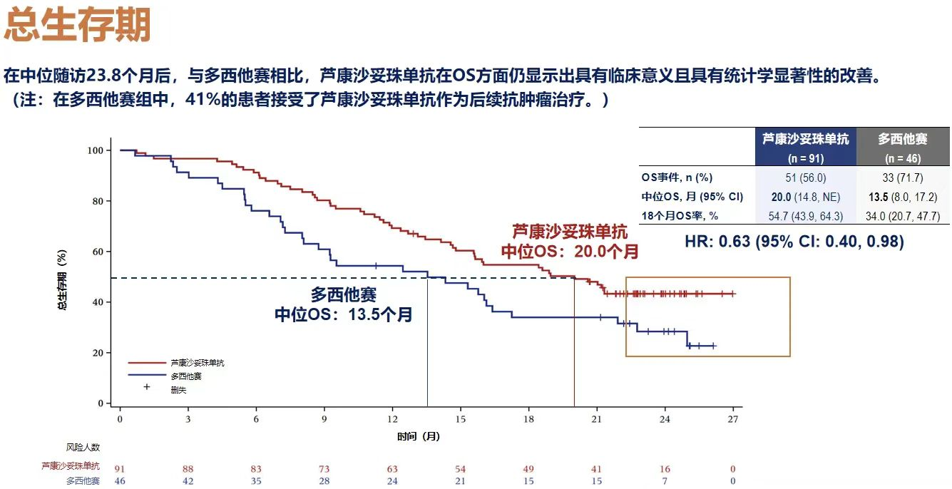 会上公布的芦康沙妥珠单抗(SKB264/Sac-TMT)用于经EGFR-TKI和含铂化疗治疗失败的EGFR突变阳性(EGFRm)晚期非小细胞肺癌(NSCLC)患者最终总生存期(OS)研究数据惊艳全场:中位随访23.8个月,芦康沙妥珠单抗组中位OS达20.0个月(对照组13.5个月),死亡风险显著降低37%,一举突破既往生存数据天花板,而这一成果也让芦康沙妥珠单抗 —— 这款全球首个获批肺癌适应症的TROP2抗体偶联药物(ADC),以坚实的中国原研数据,成为全球唯一公布此类患者显著生存获益的TROP2 ADC,为EGFR-TKI和含铂化疗后NSCLC治疗树立了全新标杆。