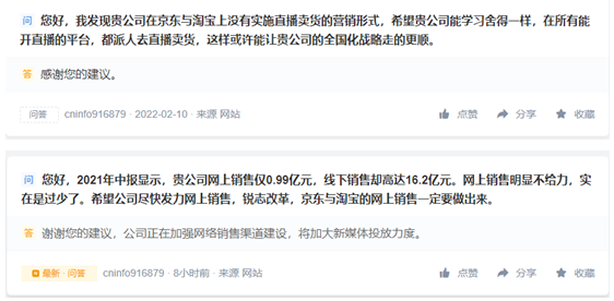 3月28日,有投资者再一次注意到了这个问题:“2021年中报显示,贵公司网上销售仅0.99亿元,线下销售却高达16.2亿元。网上销售明显不给力,实在是过少了。希望公司尽快发力网上销售,锐志改革,京东与淘宝的网上销售一定要做出来。”