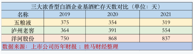 数据来源:根据五粮液、泸州老窖和洋河股份2019年至2021年三年的年报数据,胜马财经整理计算,制成上表。注:基酒贮存天数=360天/基酒周转次数;基酒周转次数=营业成本/【(基酒期末余额+基酒期初余额)/2】