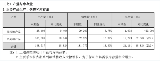 但反观五粮液营收占比达到20.4%的系列酒产品,生产量16万吨,同比增长20.64%;销售量达到15.3万吨,同比增长15.32%;库存量则达到1.9万吨,同比大增67.36%。仅从产销角度来看,五粮液的系列酒产品库存量大增近七成,且五粮液将大部分产能侧重在了系列酒产品上。