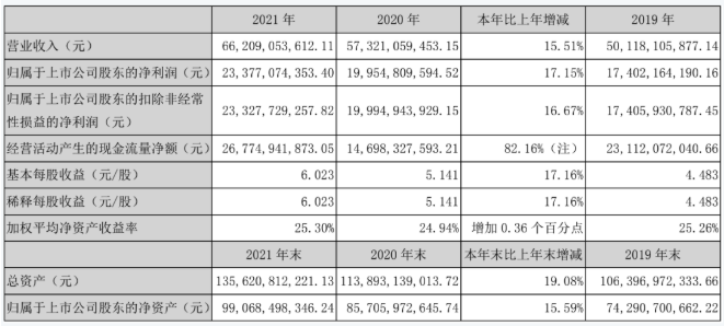 2021年,五粮液实现营收662.09亿元,同比增长15.51%;实现净利润233.77亿元,同比增长17.15%;实现扣非净利233.28亿元,同比增长16.67%。五粮液给出了每10股派发现金红利30.23元(含税),共计分配现金117.34亿元。这也是五粮液分红连续第二次过百亿,连续7年分红率达到50%。