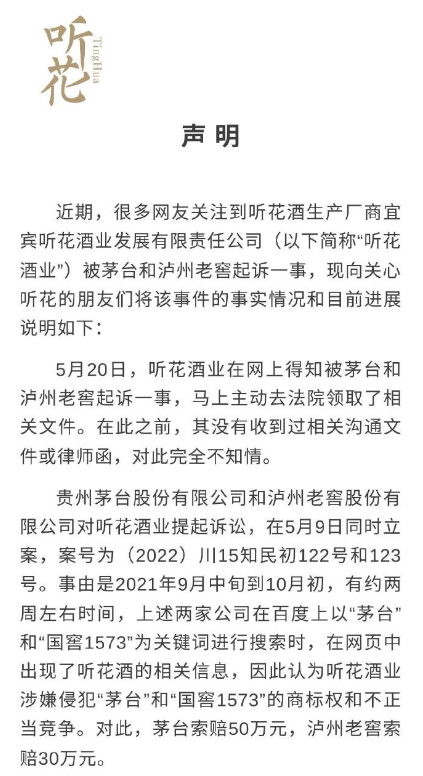 5月26日下午,微博ID为“听花酒”的账号发布一则声明,声明称近期很多网友关注到听花就业被茅台和泸州老窖起诉一事,现把事件的情况和进展进行说明。