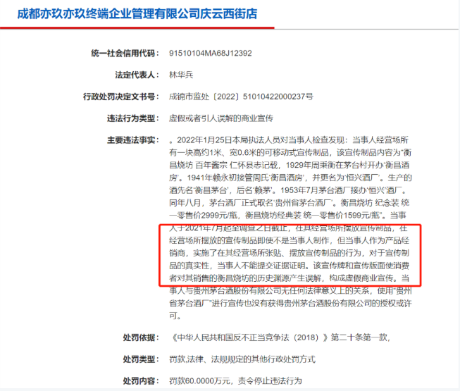 胜马财经获悉,近日,有关衡昌烧坊经销商涉“虚假商业宣传被罚”一事在白酒圈引发关注。据成都市场监督管理局开出罚单显示,衡昌烧坊在线下宣传过程中引用了茅台酒厂等与企业无关联的内容,涉嫌误导消费者。