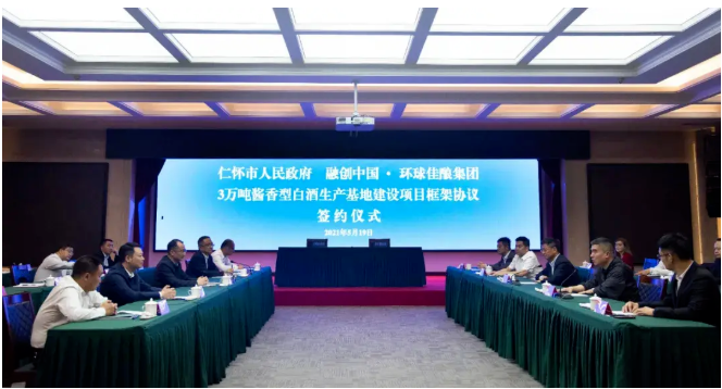 2021年5月19日,仁怀市政府与融创中国·环球佳酿酒业集团举行酱香型白酒生产基地建设项目框架协议签约仪式。仁怀市委主要领导,融创中国董事会主席孙宏斌,环球融创会展文旅集团董事长、环球佳酿酒业集团董事长邓鸿出席并见证签约。