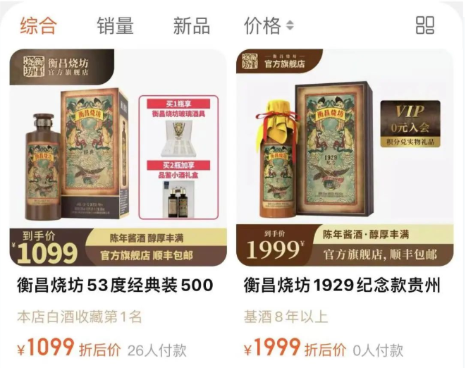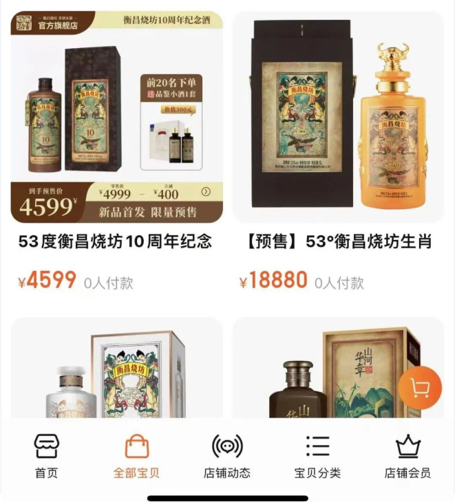 据了解,衡昌烧坊53度经典装官方指导价1599元/瓶,网购平台标价1099元/瓶,指导价堪比飞天茅台。衡昌烧坊1929纪念款贵州网购平台显示原价2699元/瓶,折后价为1999元/瓶;而53度的衡昌烧坊10周年纪念酒,售价高达4599元/瓶,甚至显示正在预售的53度衡昌烧坊生肖酒,售价达到了18880元/瓶。
