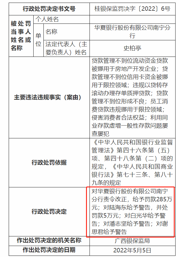 就在5月12日,银保监会官网显示,华夏银行南宁分行因6项案由被罚款285万并责令改正。此外,该行共有4位相关责任人被罚。