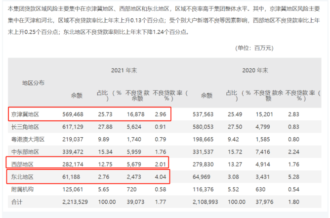 不良率为什么会这么高?华夏银行在2021年年报中称:“本集团贷款区域风险主要集中在京津冀地区、西部地区和东北地区,区域不良率高于集团整体水平。”