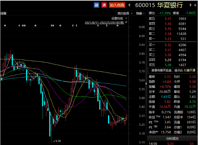 今年以来,华夏银行股价受挫,自2022年年初至今,华夏银行股价呈波浪式震荡下跌,从高点5.89元/ 股最低下跌5.1元/股,截至5月23日,该行股价报收5.32元/ 股,较年初已下跌5%。