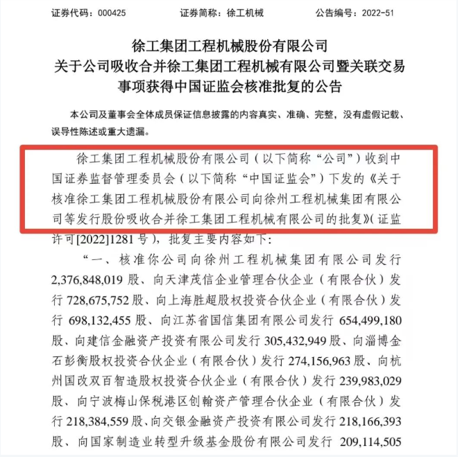 胜马财经获悉,7月8日,徐工机械发布公告称,公司收到中国证监会《关于核准徐工集团工程机械股份有限公司向徐州工程机械集团有限公司等发行股份吸收合并徐工集团工程机械有限公司的批复》,核准公司发行股份吸收合并徐工集团工程机械有限公司。
