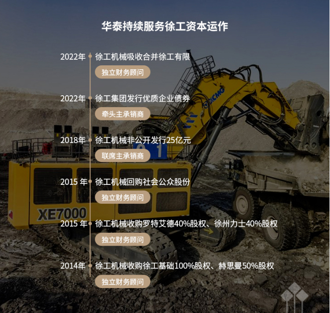 公开资料显示,华泰证券多年来持续服务徐工资本运作,自2014年起先后助力其完成股权收购、股份回购、非公开发行、优质企业债券发行等,协同华泰证券全业务链体系,为徐工提供投资者沟通、财富管理等全方位的资本市场服务。