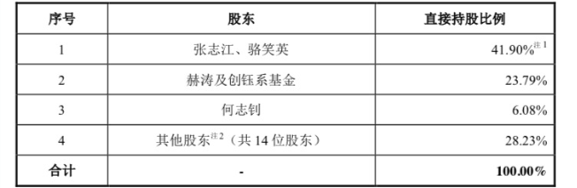绿通科技在最新一轮问询的回复函中表示(如图),实控人张志江及其一致行动人骆笑英直接及间接拥有发行人43.05%股份(直接持股41.90%+间接持股1.15%),赫涛及创钰系基金合计持股比例为23.79%,另一位持股 5% 以上股东何志钊的持股比例为6.08%,赫涛及创钰系基金、何志钊的持股比例大幅低于张志江、骆笑英的持股比例。