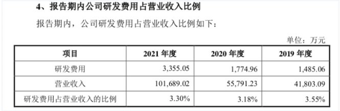 公司选取的同行业可比公司春风动力(603129.SH) ,仅2021年一年的研发费用就达1.32亿元,占比总营收的4.82%。
