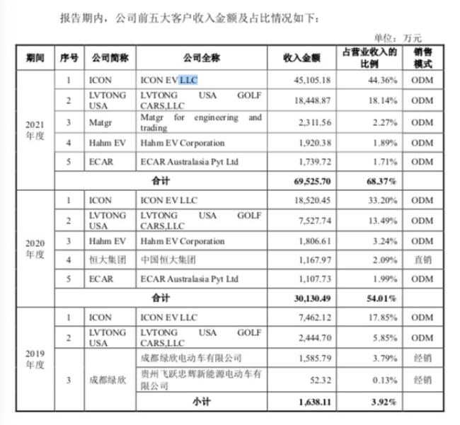 把注意力回转到业务本身,绿通科技的核心产品是高尔夫汽车。招股书显示,2019年-2021年,绿通科技的营业收入分别为4.18亿、5.58亿和10.17亿元,净利润分别为4853.56万元、5212.86万元和1.27亿元。