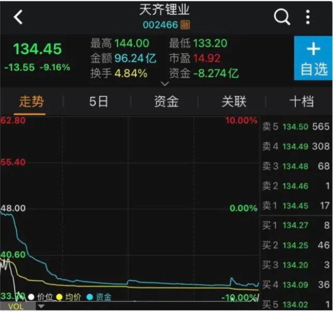 胜马财经获悉,7月11日,A股锂矿板块龙头天齐锂业开盘没多久,便直奔跌停板,最终收跌9.16%,股价报收134.45元/股。