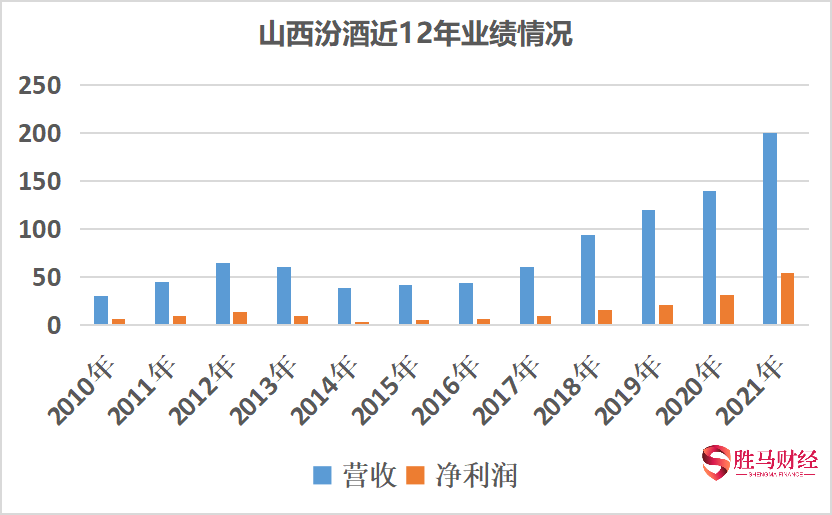 过去十二年,山西汾酒对标贵州茅台,喊出汾酒复兴的口号,尽显“汾老大”底蕴和气势。2010年至2021年,山西汾酒营收从30.17亿元增长至199.71亿元,年复合增长率达18.75%;净利润则从6.02亿元增至53.9亿元,年复合增长率达22.05%。