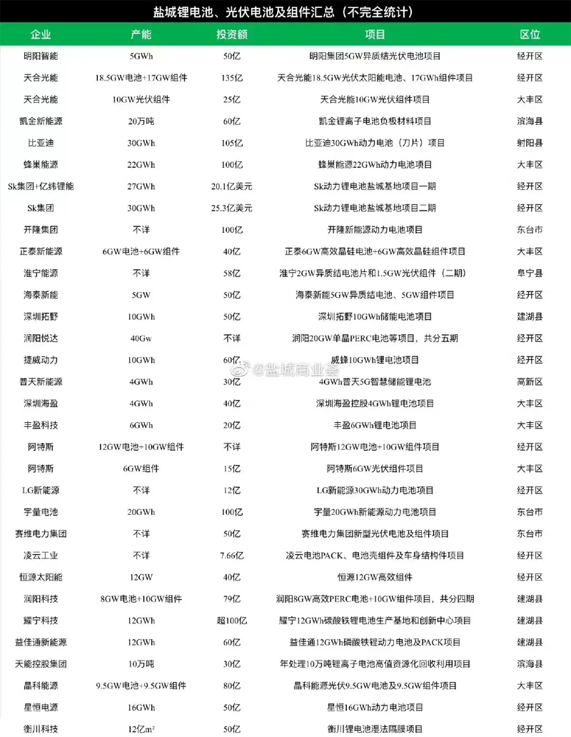 2022年上半年,天合(大丰)储能系列项目在盐城开工。此前,已有阿特斯、天合光能、协鑫集团、润阳等一大批大型知名光伏装备制造企业在盐城落户投产。