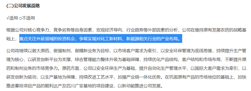 看似突然之举,实则有备而来,不仅如此,在2021年报的经营计划一项,丰山集团也作出明确表达:以围绕“化工产业”为中心,借助公司上市环保安全管理优势、区位优势,通过并购、技术合作等方式布局化工新材料及与化工产业相关的新能源等精细化工项目。