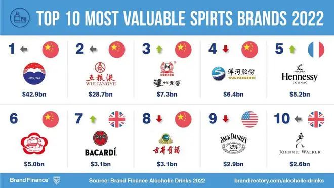 在Brand Finance最新发布的《2022年度全球最具价值烈酒品牌50强》的榜单中,泸州老窖的排名上升了一位,处于显著的第三位置上,品牌价值有了大幅度提升。