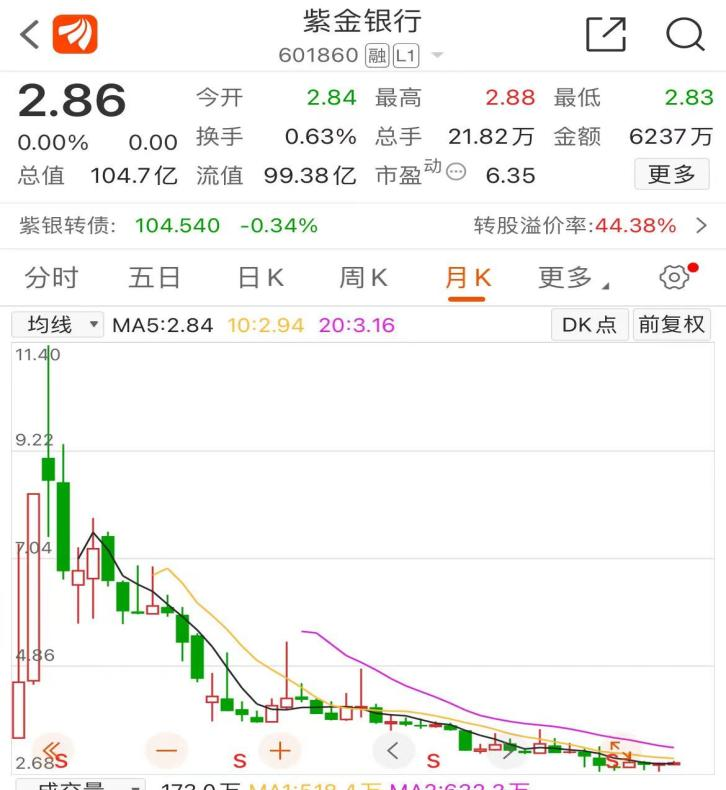 截至2022年9月13日,紫金银行股价报收2.86元/股,总市值达到104.7亿,市盈率6.35倍。