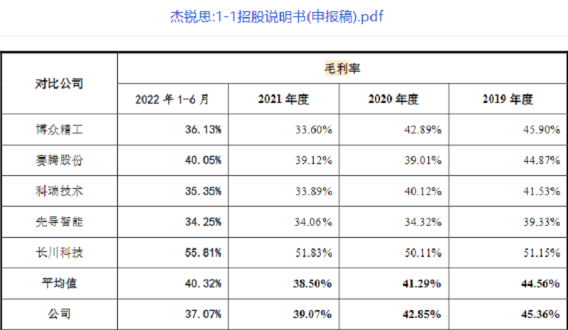 不过,作为对比,从2019年至2022年上半年,杰锐思综合毛利率分别为45.36%、42.85%、39.07%和37.07%,下滑趋势明显。对此,杰锐思解释称,公司以3C业务为基础,积极切入具有市场前景的新领域,不过市场开拓阶段的新产品综合成本较高。
