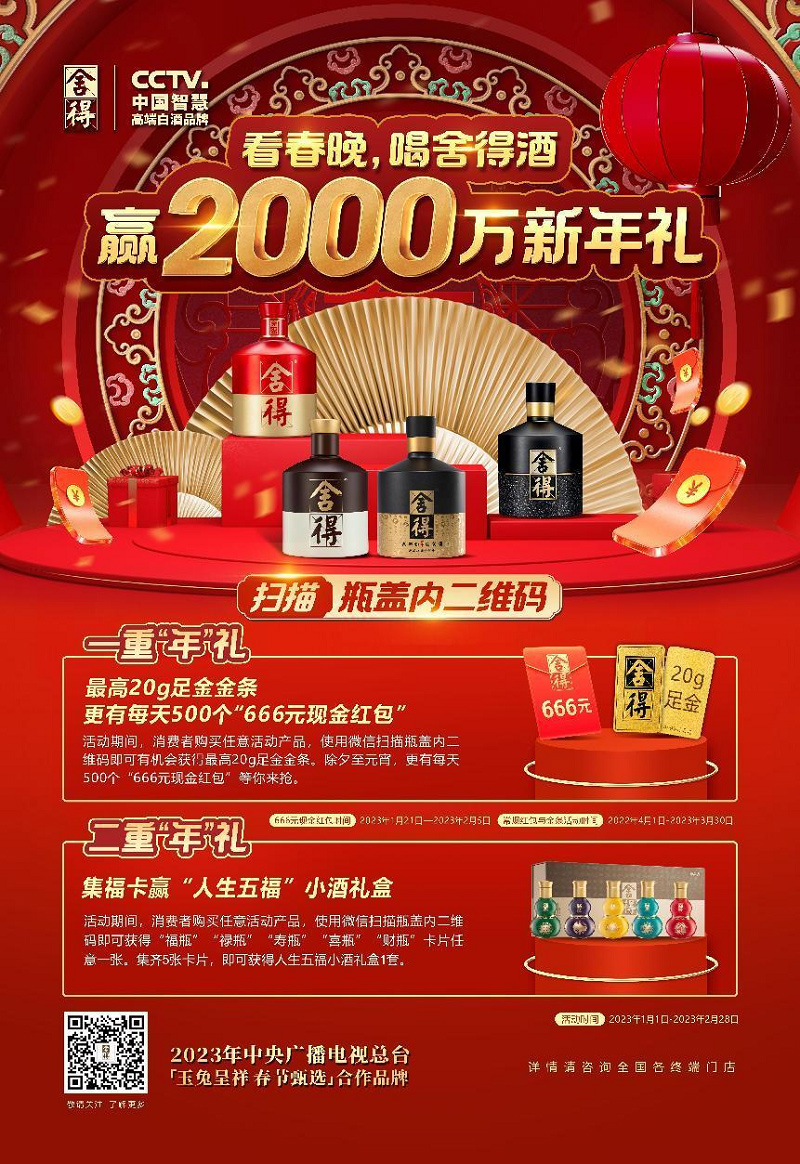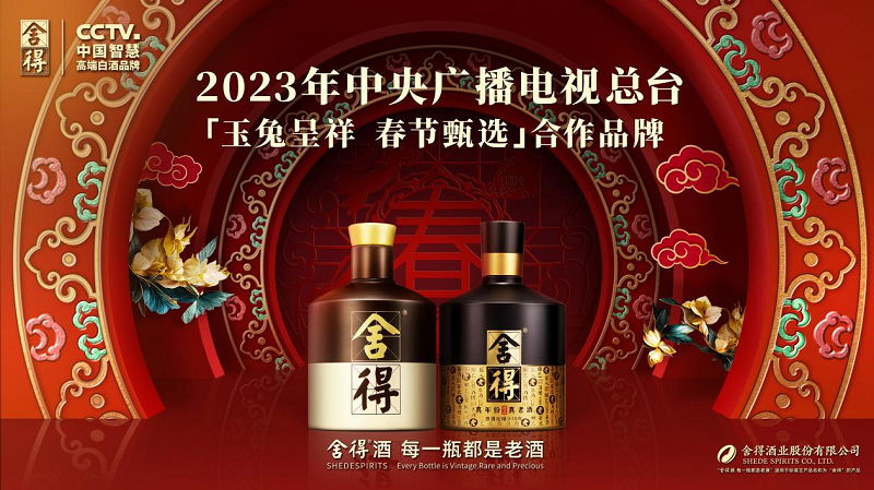 据悉,舍得酒将作为2023年中央广播电视总台“玉兔呈祥,春节甄选”合作品牌,亮相央视春晚舞台。在吉庆欢乐的大舞台上,舍得将同中华各族儿女一起见证中国日新月异的发展,感受中国智慧、中国精神,并向全国人民和全球华人送上新春祝福。