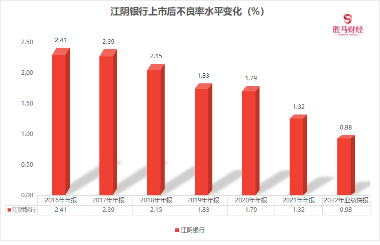 2016年是江阴银行上市首年,这一年该行的不良率是2.41%,而到了2022年末,江阴银行的不良率已经进入“1%”俱乐部,从同行末游进入行业前列。