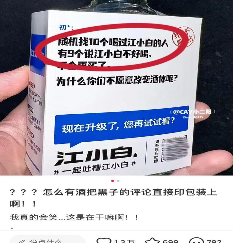 但是近日在某社交平台上,一个“奇葩”的产品包装设计却火了,随着发帖人一句“怎么有酒把黑子的评论直接印在包装上啊!!”的感叹,“差评”版江小白瞬间成为了讨论的焦点。
