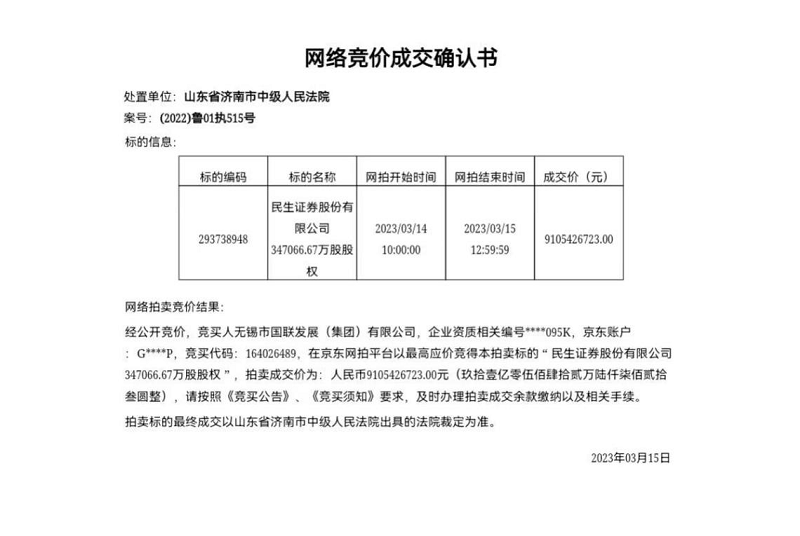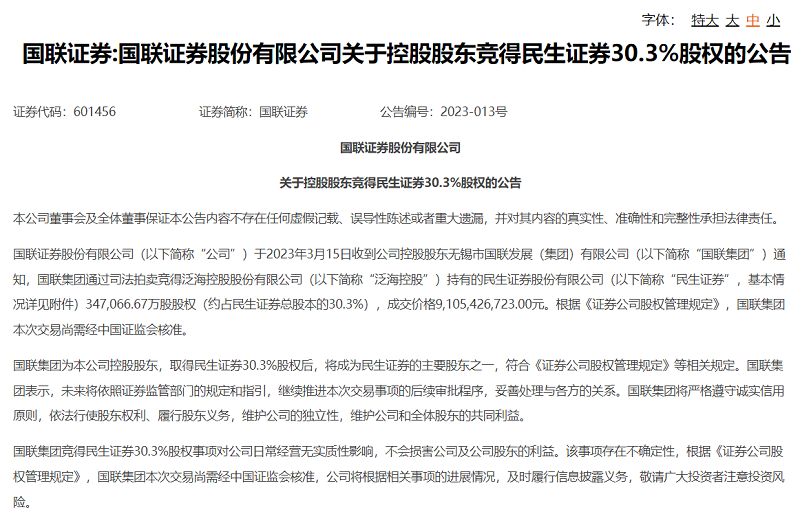 3月16日,国联证券发布公告称,3月15日收到公司控股股东无锡市国联发展(集团)有限公司(以下简称“国联集团”)通知,国联集团通过司法拍卖竞得泛海控股股份有限公司(以下简称“泛海控股”)持有的民生证券34.71亿股股权(约占民生证券总股本的30.3%),成交价格91.05亿元。根据《证券公司股权管理规定》,国联集团本次交易尚需经中国证监会核准。