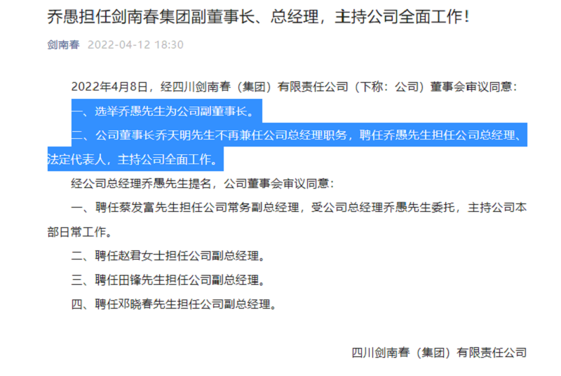 企查查最新数据显示,乔天明与其子乔愚通过直接或间接分别持有剑南春30.399%、1.1192%,合计持股31.5182%。2022年4月12日,剑南春官方发布信息称,乔愚担任剑南春集团副董事长、总经理,主持公司全面工作。