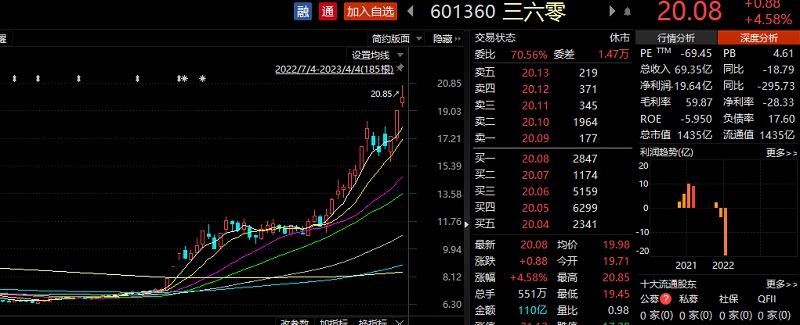 今年,360公司因搭上ChatGPT概念股价也随之起飞,2月以来的股价涨幅已经超过186%。截至4月4日收盘,360的股价为20.08元/股,总市值也达到了1435亿元。