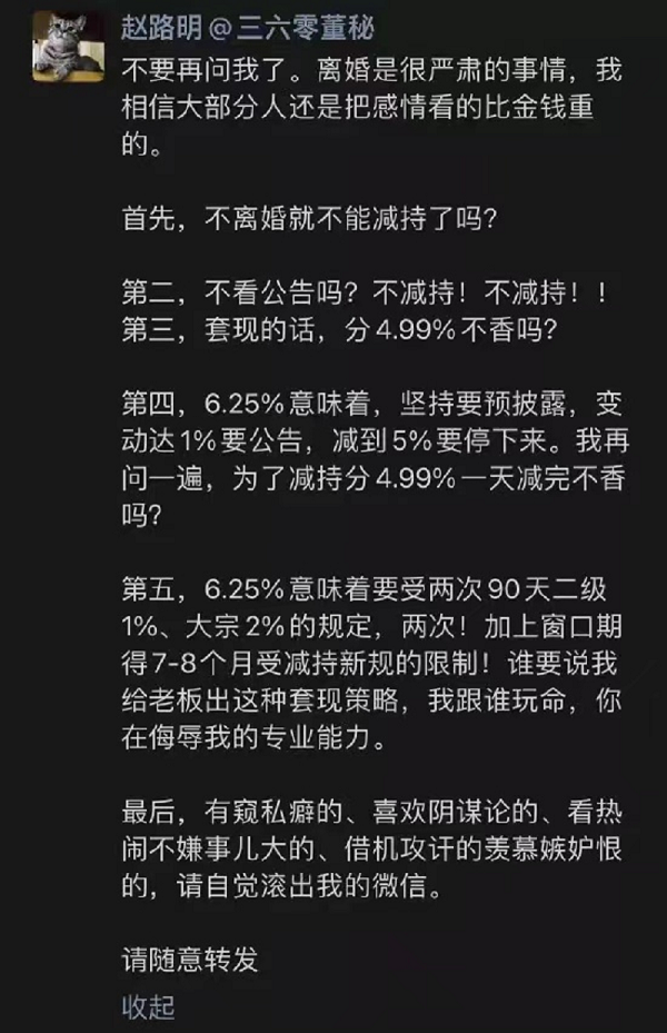 360董秘赵路明发文回应此事称:“离婚是很严肃的事情,我相信大部分人还是把感情看得比金钱重的。”