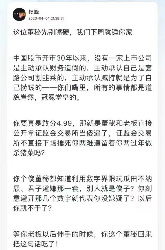 杨峰发文称:“这位董秘先别嘴硬,我们下周就锤你家”,并表示中国股市开市30年以来,没有一家上市公司是主动承认财务造假的,主动承认自己是套路公司割韭菜的,主动承认减持就是为了自己捞钱的——你们嘴里,所有的事情都是道貌岸然,冠冕堂皇的。