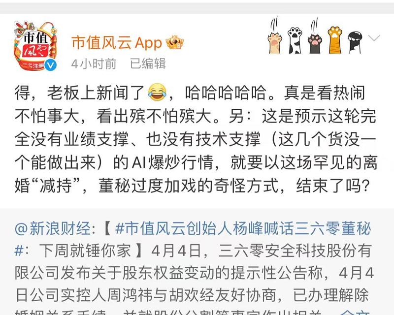 市值风云app官方微博账号也于4月5日发文力挺老板,称“(360)这轮完全没有业绩支撑、也没有技术支撑 (这几个货没一个能做出来)的AI爆炒行情,就要以这场罕见的离婚“减持”,董秘过度加戏的奇怪方式,结束了吗?”