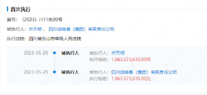 执行信息显示,剑南春集团以及董事长乔天明被执行标的达到了18.64亿元,执行法院为乐山市中级人民法院。