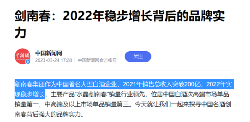 根据中国新闻网今年三月的一份报道中称,“剑南春集团作为中国著名大型白酒企业,2021年销售总收入突破200亿,2022年实现稳步增长”。