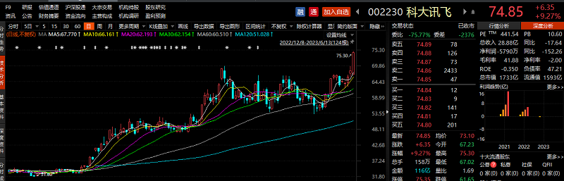 在星火认知大模型的手机版本上线的前后几天里,科大讯飞股价再度拉升近17%(6月9日-14日),6月14日收盘价达到75.13元。