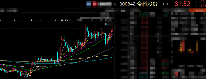 打开K线图可以发现,今年以来公司股价一路上扬。3月20日,公司股价报收45.08元/股,盘中最低价为42.50元/股。自此开始,帝科股份的股价就节节攀升,在近三个月的时间内,先后经过了四段上涨区间。截至6月21日,报收81.52元/股,总市值达到了81.72亿元。