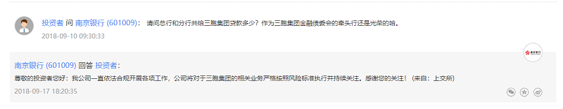 2018年9月,一位投资者在互动平台问道:“请问总行和分行共给三胞集团贷款多少?”