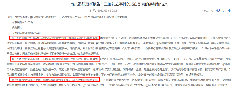 2022年7月4日,浙商证券发布研报,题为《南京银行更新报告:三则独立事件的巧合引发的误解和错杀》。