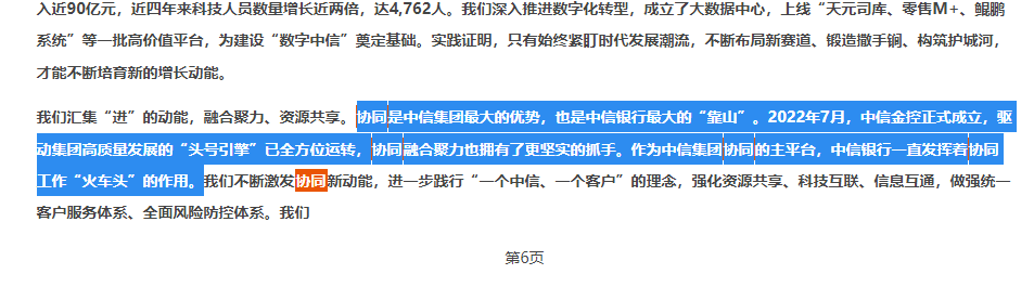 中信银行在2022年年报中开门见山表示,“协同是中信集团最大的优势,也是中信银行最大的‘靠山’。2022年7月,中信金控正式成立,驱动集团高质量发展的‘头号引擎’已全方位运转,协同融合聚力也拥有了更坚实的抓手。作为中信集团协同的主平台,中信银行一直发挥着协同工作‘火车头’的作用。”