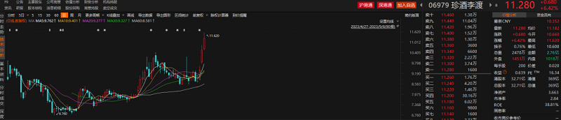 次日,珍酒李渡股价行情延续,截至发稿时,盘中涨幅突破6.42%,股价达到11.28元/股,总市值逼近370亿港元。