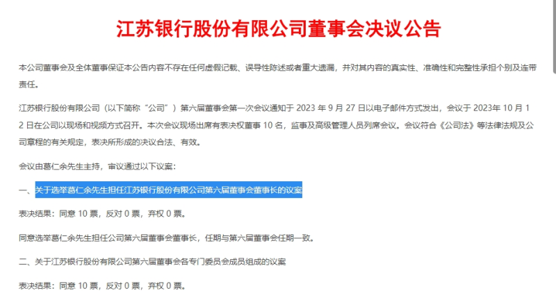10月12日晚公告显示,江苏银行第六届董事会第一次会议通知于 2023 年 9 月 27 日以电子邮件方式发出,会议于 12 日当天在公司以现场和视频方式召开,此次会议由葛仁余主持。也是其首次以董事长身份出席董事会。