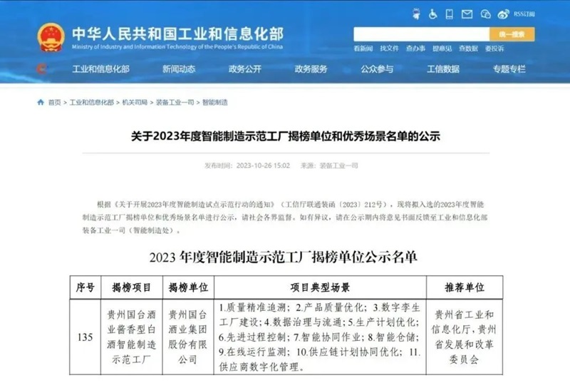 据了解,该名单由工业和信息化部、国家发展和改革委员会、财政部、国务院国有资产监督管理委员会、国家市场监督管理总局联合公布,共212家单位、605个场景入选。其中贵州共有3个项目入选“智能制造示范工厂揭榜单位”,2个场景入选“智能制造优秀场景”,国台是贵州白酒行业唯一入选的企业。