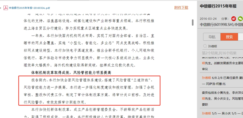 颇有些讽刺的是,在中信银行2014年年报中,孙德顺发表开篇致辞时表示,“本行加快全面风险管理体系建设,搭建了风险管理“三道防线”,风险管控能力进一步提高。”