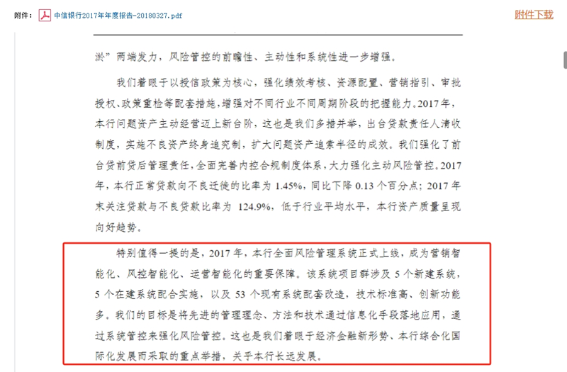 同时在中信银行2017年年报中,孙德顺发表致辞时还表示:“2017年,本行全面风险管理系统正式上线,成为营销智能化、风控智能化、运营智能化的重要保障。该系统项目群涉及5个新建系统,5个在建系统配合实施,以及53个现有系统配套改造,技术标准高、创新功能多。”