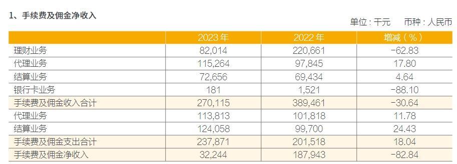 具体看,2023年手续费及佣金中,理财业务和银行卡业务收入分别同比下降了62.8%和88%,其中理财业务在手续费及佣金中占比较高,影响较大;银行卡收入规模非常小且下降幅度较大。同时手续费和佣金支出增加了18%,其中结算业务支出增速远高于相应的收入增速。