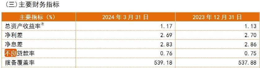 2024年一季度,常熟银行拨备覆盖率进一步提升到了539.18%,较上年末提高约2个百分点,不过不良贷款率却略有上升0.01个百分点至0.76%。