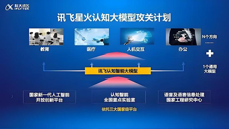 2022年12月,科大讯飞启动“1+N认知智能大模型技术及应用”专项攻关,其中“1”代表通用认知智能大模型底座,“N”代表将认知智能大模型技术应用在教育、医疗、汽车、办公、智能硬件等多个行业领域,并形成独具优势的行业专用模型。