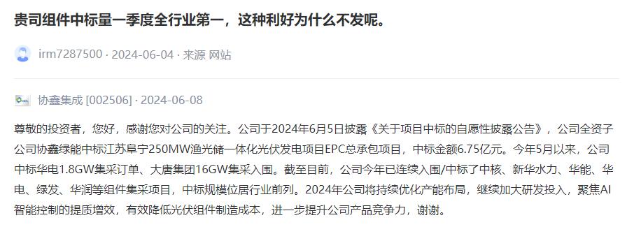对于今年的中标情况,6月8日,协鑫集成在深交所互动易上表示,今年5月以来,公司中标华电1.8GW集采订单、大唐集团16GW集采入围。截至目前,公司今年已连续入围/中标了中核、新华水力、华能、华电、绿发、华润等组件集采项目,中标规模位居行业前列。